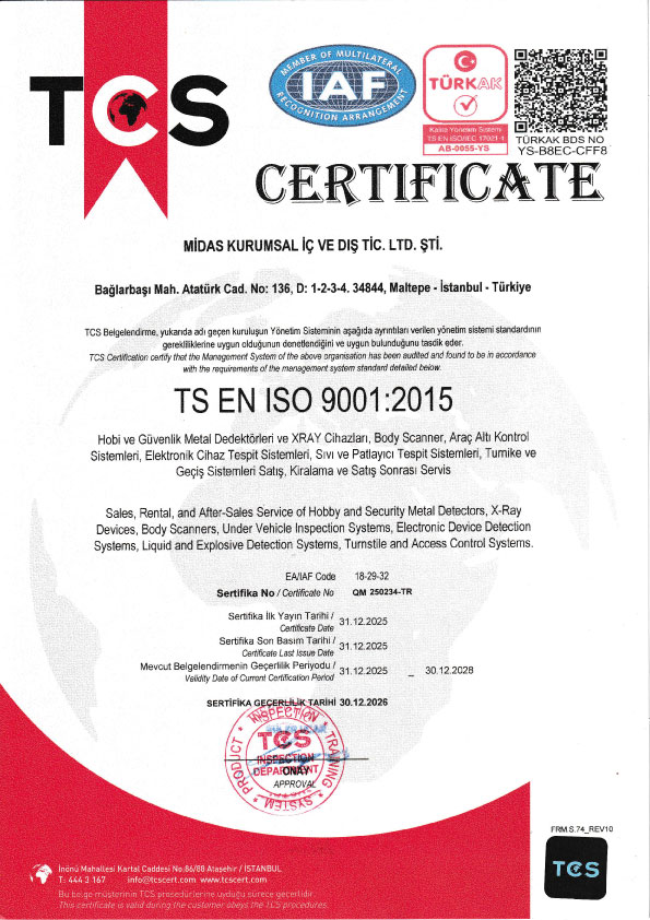 Midas Kurumsal, sektördeki başarısını uluslararası standartlarla belgelendirmiştir. Kalite yönetimi, müşteri memnuniyeti ve teknik yeterlilik alanında sahip olduğumuz sertifikalar, sunduğumuz hizmetin güvenilirliğini ve profesyonelliğini kanıtlamaktadır. Bu sertifikalar, hem kurumsal güvenlik çözümlerimizde hem de hobi metal dedektörlerimizde yüksek kalite politikamızın temelini oluşturmaktadır.